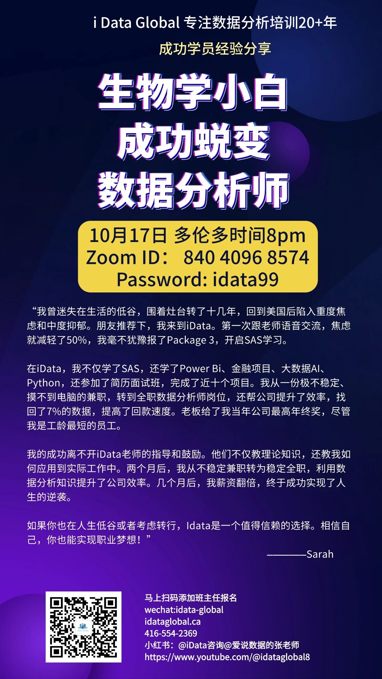 【成功学员分享】从生物学背景到数据分析师,她用数据分析重启人生 在家庭与育儿中暂别职场多年后,Sarah曾一度… Read More »From a biological background