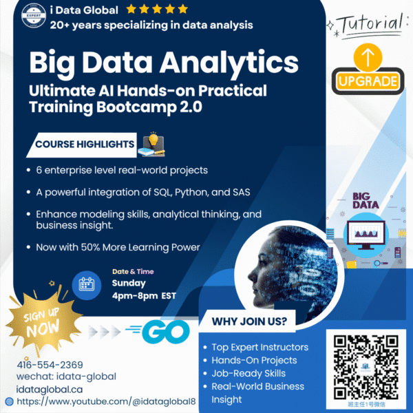 The iData “AI | Machine Learning | Big Data Analytics Project Bootcamp” has been fully upgraded! Built on real datasets from telecom, banking, insurance, and retail industries, the program covers the complete analytics workflow—from traditional statistical methods to modern AI and machine-learning algorithms—across SQL, Python, and SAS.